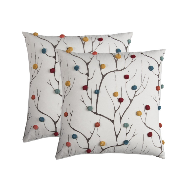 Bring a bit of fashion and zip to your space with this eye-catching and comfy 20-inch white and black coral indoor outdoor throw pillow with pompoms. Charming decorative pom-poms give this design texture along with a hand-crafted look and feel. Durable and rugged enough for outdoors but can still be used inside as well. Great to use on its own or mix with other decorations for the perfect look. 20-inch h x 20-inch w x 6.25-inch d.