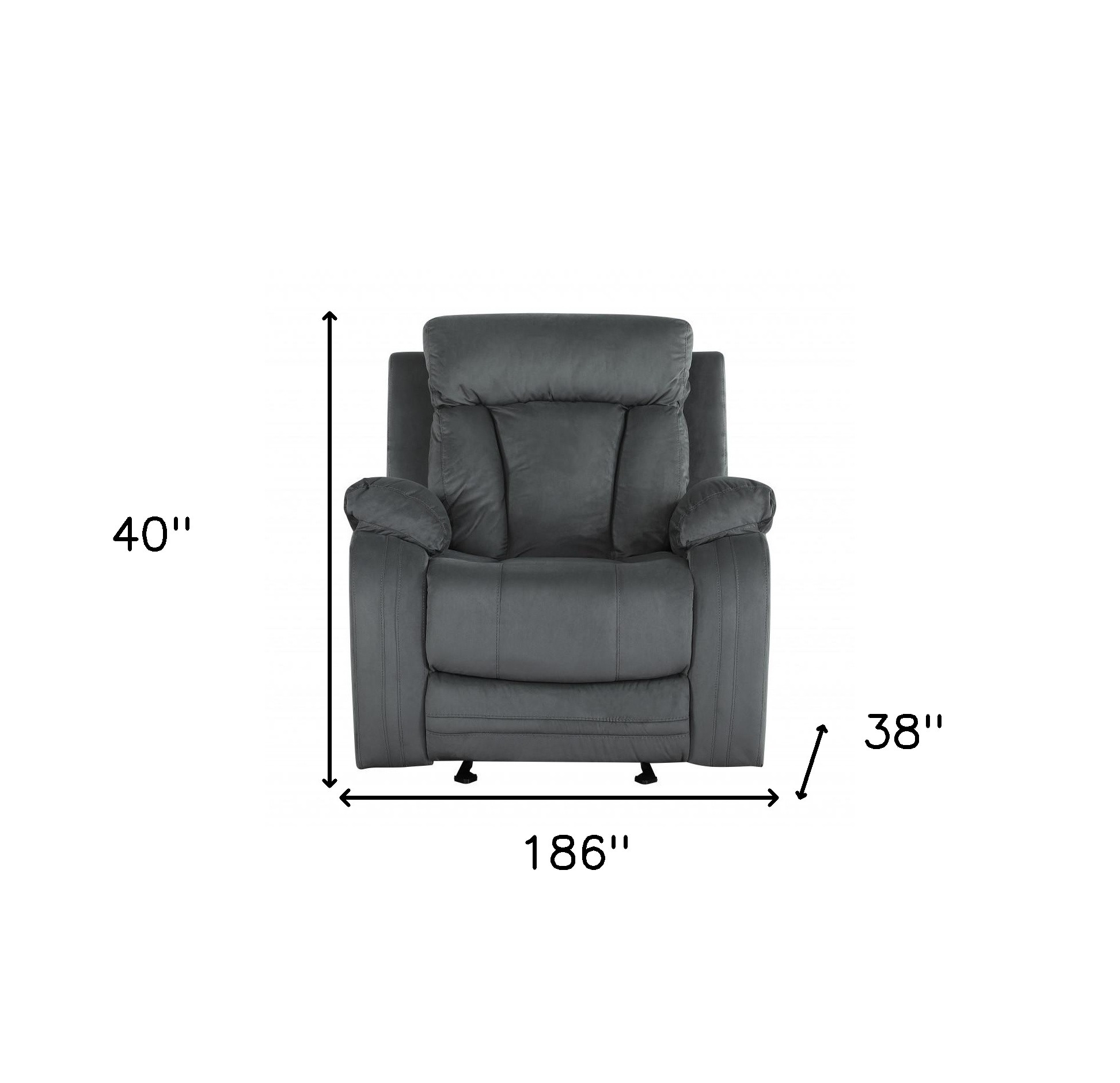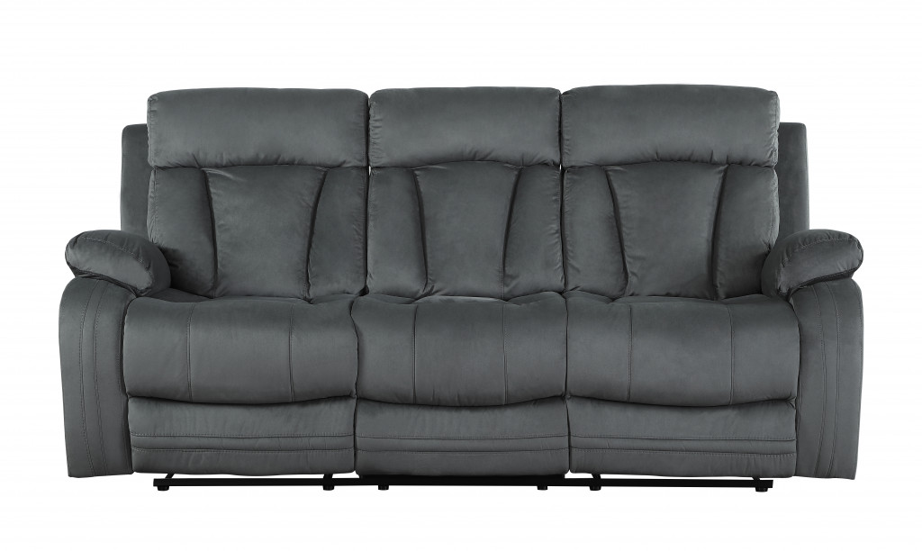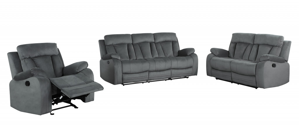Prepare to amaze even the most discerning critics with our three piece indoor gray microsuede six person seating set – the epitome of indoor seating that will leave them speechless. The reclining sofa will transform your space into a cozy haven for leisurely activities, movie nights, or even quick power naps. Let the durability of the microsuede upholstery stand the test of time, while providing you with a comfortable, stylish, and easy to clean seating experience. The presence of coil spring seat construction helps distribute weight evenly, reducing pressure points and enhancing overall comfort by minimizing the strain on specific areas of the body. The inclusion of a loveseat into your mix allows a fashionable seating option in a compact design. Chock full of value, this set has it all. 40-inch H x 186-inch W x 38-inch D